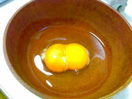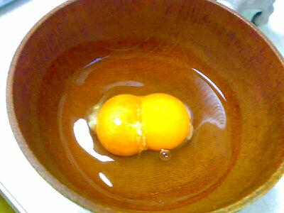 同じパックに黄身2個入りのたまごが2個入ってました。一つは黄身と黄身が離れてたけど、こりはくっついてます。
